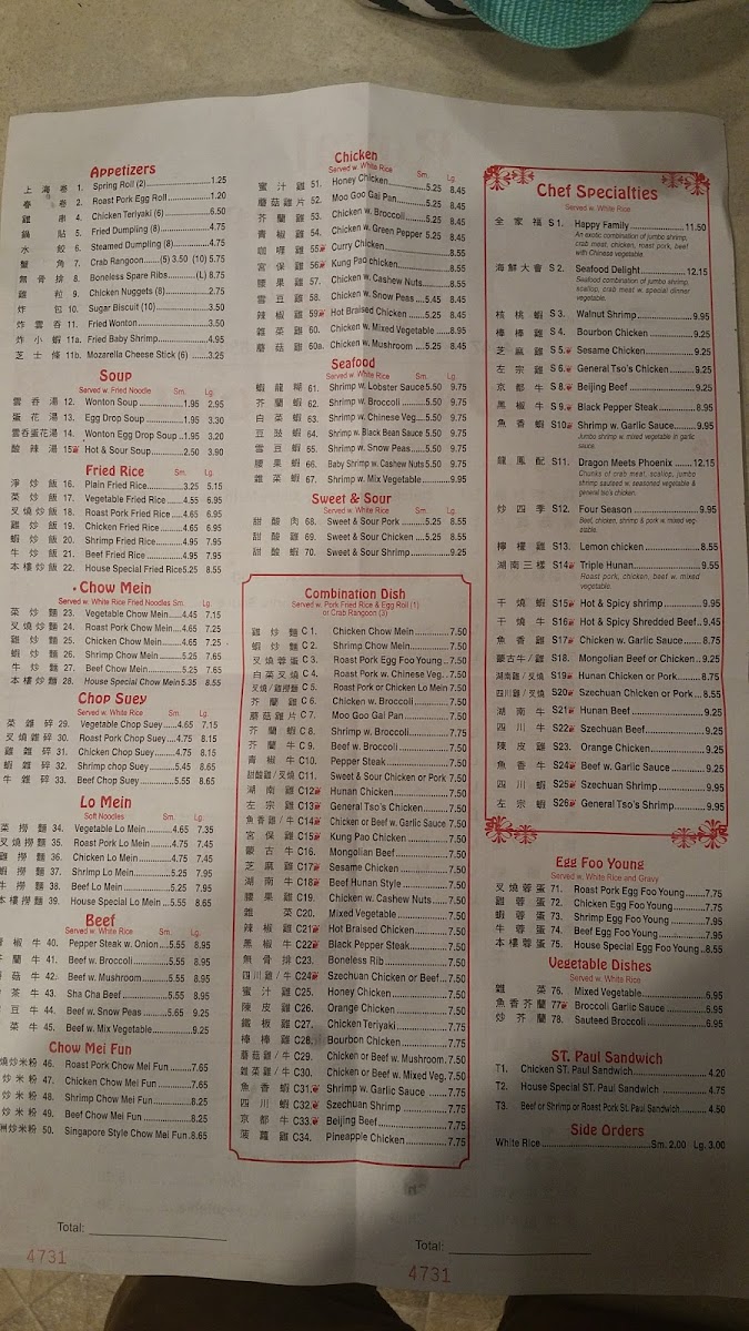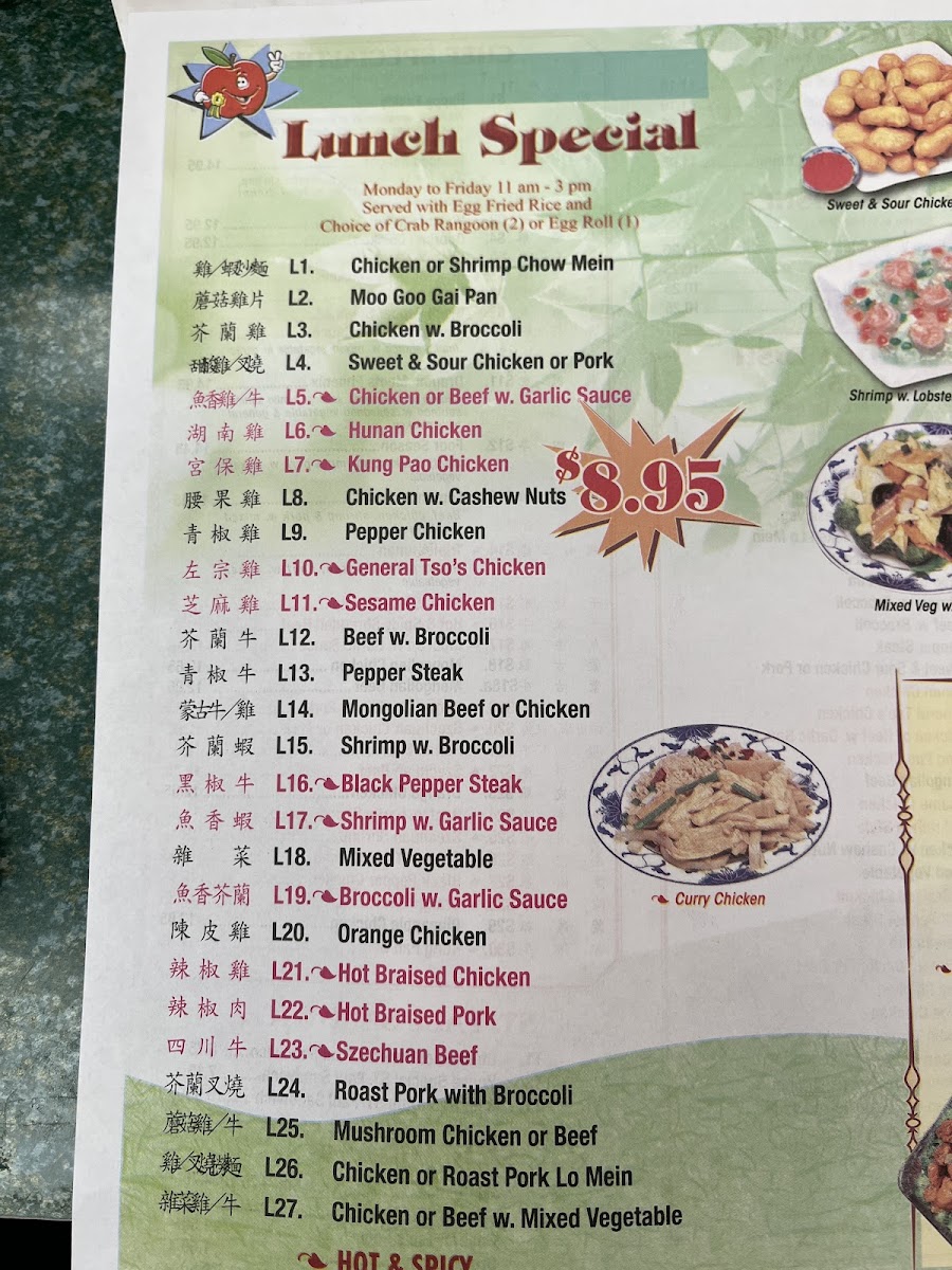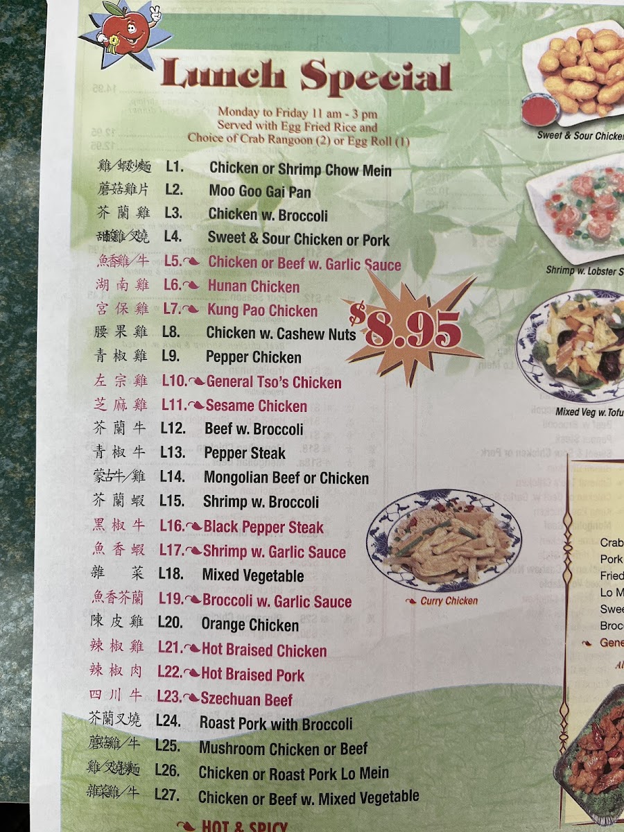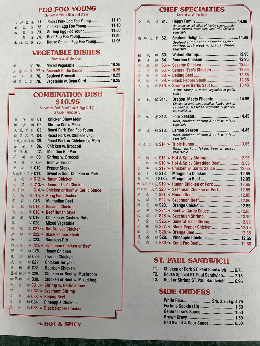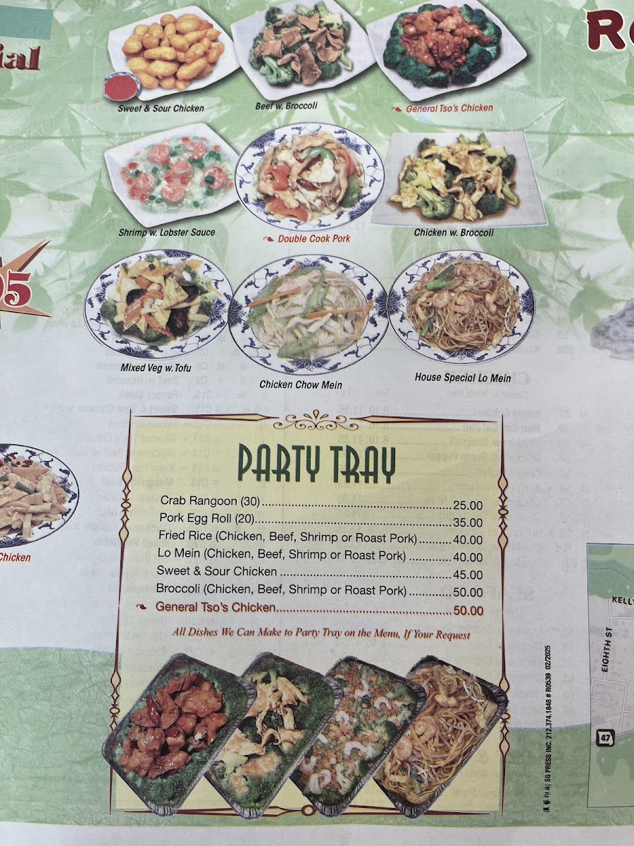 Highlights include versatile chop suey dishes that combine fresh vegetables with your choice of protein, alongside a range of seafood preparations such as shrimp with lobster sauce or cashew nuts. For group gatherings or larger meals, the party trays provide ample choices like crab rangoon, egg rolls, or fried rice, making it easy to share and enjoy a mix of flavors.